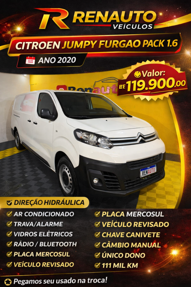 🚘 CITROEN JUMPY FURGAO PACK 1.6 🗓 ANO 2020 ✅ DIREÇÃO HIDRÁULICA ✅ AR CONDICIONADO ✅ TRAVA/ALARME ✅ VIDROS ELÉTRICOS ✅ RÁDIO / BLUETOOTH ✅ PLACA MERCOSUL ✅ VEICULO REVISADO ✅ CHAVE CANIVETE ✅ CÂMBIO MANUAL ✅ ÚNICO DONO ✅ 111 MIL KM 💰Valor: 119.900,00 🔄 Pegamos seu usado na troca!