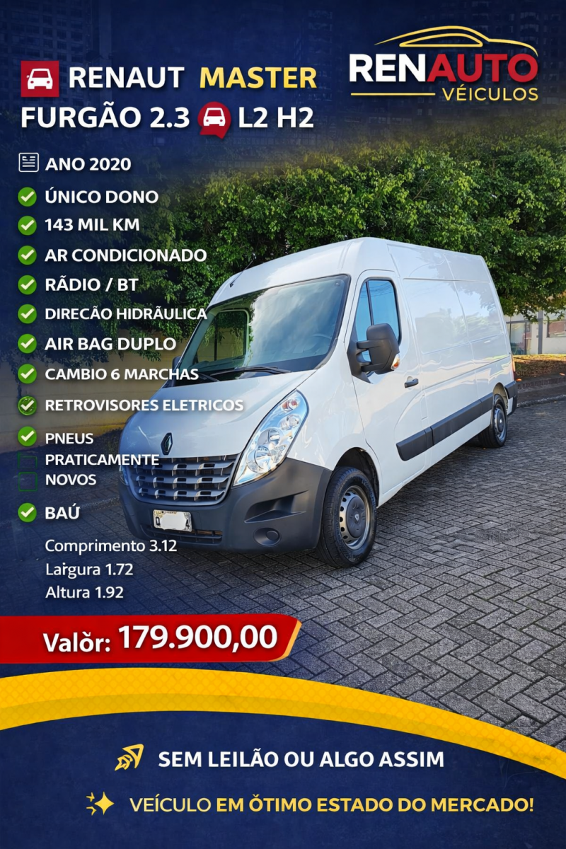 🚗 RENAUT MASTER FURGÃO 2.3 🚗 L2 H2 🗓 ANO 2020 ✅ÚNICO DONO ✅ 143 MIL KM ✅ AR CONDICIONADO ✅ RÁDIO / BT ✅DIREÇÃO HIDRÁULICA ✅AIR BAG DUPLO ✅CAMBIO 6 MARCHAS ✅ RETROVISORES ELETRICOS ✅PNEUS PRATICAMENTE NOVOS ✅ BAÚ ✅Comprimento 3.12 ✅Largura 1.72 ✅Altura 1.92 🚀SEM LEILÃO OU ALGO ASSIM ✅VEÍCULO EM ÓTIMO ESTADO 💰179.900,00